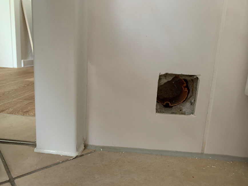 Die Mängel 1,2 und 5 wurden daraufhin einigermaßen abgestellt. Zu Mangel 3 erhielt ich eine mir völlig unverständliche Antwort vom Technik-Verantwortlichen: „Dieses bleibt offen, lediglich flurseitig wurde dieses Loch aus Gründen der Optik mit Tapete verschlossen“ Und zu Mangel 4 antwortete er: „Die Spiegelfliesen sind Bestandteil des „bestehenden Bades“, diese können Sie sehr gern selbst entfernen oder einen für sie ästhetisch ansprechenden Spiegel drüber hängen.“ Ich habe sie dann selbst entfernt.